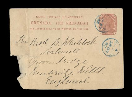 442 c H&G #2 imageH&G #2, 1881 1 1/2p Brown on buff postal card, rare used card to England being the proper rate within correct period of usage, with blue "Grenada/SP 07 82" c.d.s. with index letter "A", legitimate usage with commercial message ordering black tea, creasing to card and defective at left from being affixed in a book, with missing piece at bottom left, still exceptionally rare and the only example used paying the proper rate for which it was intended that we are aware of. (Image) Est. 200-300