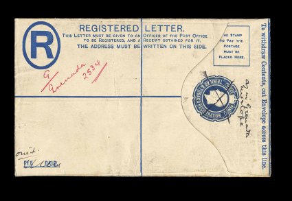 443 E image1929 3p Dark blue registered envelope essay, this being from the De La Rue archives consisting of a regularly issued 3p George V registered envelope of Trinidad and Tobago (H&G #C4a; 152x96mm), with the stamp imprint crossed out and written "as in Grenada/Envelope", "Fee Paid" at lower left also crossed out and marked "omit", plus a white typed label with new text for the reverse affixed over old text, in red manuscript on front "G/Grenada 2534" archival note, slight soiling otherwise very fine; an interesting working essay of the printer. (Image) Est. 400-500