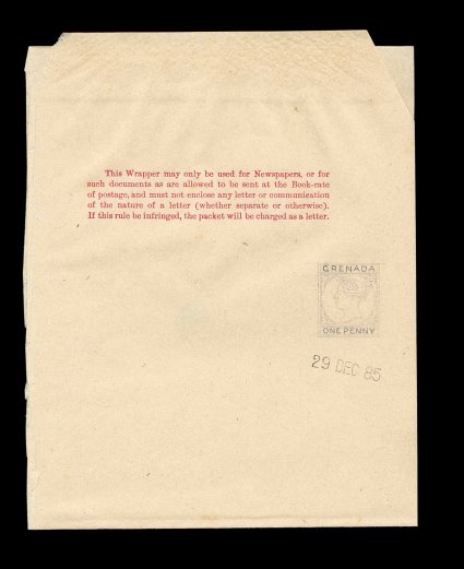444 E H&G #E2 imageH&G #E2, 1886 1p Newspaper wrapper artist's essay, gummed and die-cut wrapper with printed five-line instruction paragraph common to British wrappers of this period, but without the stamp imprint and instead an artist's pencil drawing for the 1p Victoria for Grenada as issued, handstamped "29 Dec 85" date of the De La Rue archives, minor thinning along left edge where undoubtedly affixed to archival sheet, otherwise very fine; a wonderful unique essay of this early postal stationery issue; ex-Towers. (Image) Est. 500-750
