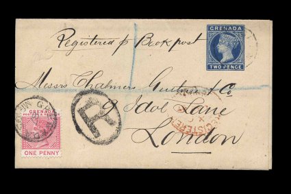 445 c H&G #E4 imageH&G #E4, 1886 2p Dark blue newspaper wrapper, the scarcest value of this first issue wrapper series, used to pay the registry fee with 1887 1p Carmine tied by "Grenada/MR 05/87" c.d.s., with the instructions "Registered p Bookpost", red London registry oval, very fine; an unusual usage and rare. (Image) Est. 150-200