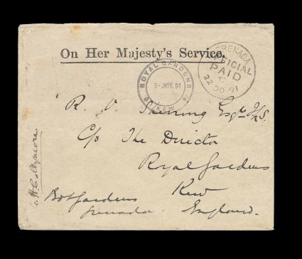 446 c image1891 OHMS official cover with clear strike of "Grenada/22 OC 91/Official Paid" c.d,s,, endorsed "Bot(anical) Gardens/Grenada", the government agency using the free franking and signed C.H. Collymore, all required for proper official use, sent to the Royal Gardens in Kew, England with postal backstamp of that town and attractive double circle dated cachet of the Royal Gardens on the front, slight edge wrinkles, otherwise very fine; this is the earliest known usage of the "Official Paid" c.d.s. (Image) Est. 200-300