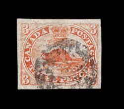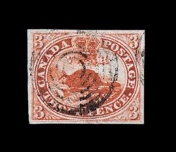 452 O 1 image#1, 1851 3p Red, select used example, featuring uniformly large margins all around, strong rich color and a crisp impression, light target cancellation, extremely fine and choice (Unitrade C$1,600.00). (Image) 800.00