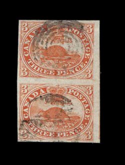 454 O 1 image#1, 1851 3p Red, very scarce used vertical pair, full to very large margins all around including portions of the adjoining frame lines at right, sumptuously rich color and a strong impression, light target cancels, tiny insignificant crease in bottom stamp, still very fine and attractive (Unitrade C$3,200.00+). (Image) 1,600.00+