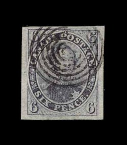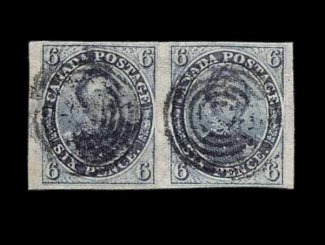 455 O 2 image#2, 1851 6p Grayish Purple on laid paper, very scarce used horizontal pair, ample to huge margins all around, rich color, central target cancels, very fine; pairs of this stamp are very seldom encountered, especially in this premium condition; 1960 PF certificate; ex-Jarrett (Unitrade C$5,000.00+). (Image) 2,700.00+