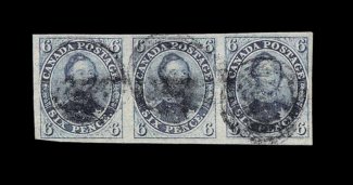 456 O 2 image#2, 1851 6p Grayish Purple on laid paper, horizontal strip of three, large to huge margins all around except cut just a little close at bottom left, lovely rich color, choice very fine; any multiple of this stamp is very scarce, and to combine that with the impressive quality of this strip makes it extremely rare; 1972 RPS and 1977 PF certificates; ex-Hilmer (Unitrade C$7,500.00+). (Image) 4,050.00+