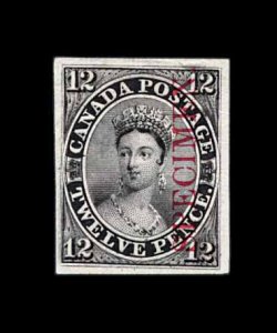 458 P 3Pi imageUnitrade #3Pi, 1851 12p Black, plate proof on India, with carmine "SPECIMEN" overprint reading vertically, large even margins all around, a fresh and extremely fine example of this very scarce proof. (Image) Unitrade C$1,750.00