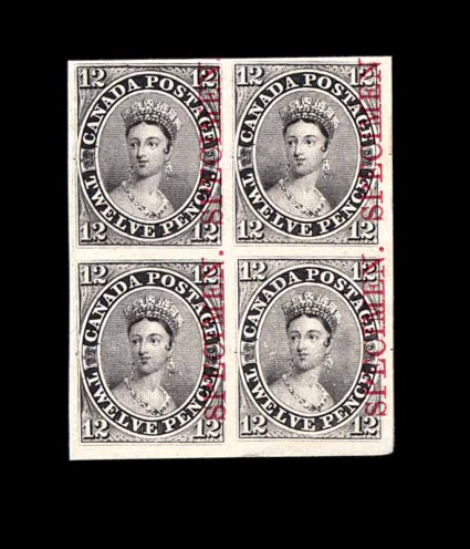 459 Pbl 3Pi imageUnitrade #3Pi, 1851 12p Black, plate proof on India, with carmine "SPECIMEN" overprint reading vertically, bottom right corner margin block of four (positions 89-90/99-100), mounted on card, mostly large margins all around, quite fresh, an extremely fine and very rare showpiece. (Image) Unitrade C$7,000.00+