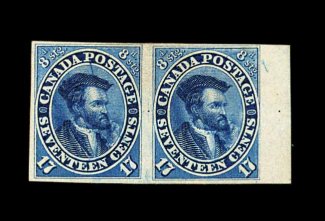 501 og 19b image#19b, 1859 17c Blue, imperforate, right sheet-margin horizontal pair, without gum as issued, other three margins full to large, deep color and impression, left stamp with inked line (plate crack), extremely fine; only one sheet of 50 pairs was printed; 1981 PF certificate (Unitrade C$6,000.00). (Image) 4,000.00