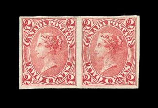 503 og 20b image#20b, 1864 2c Rose, imperforate, horizontal pair, without gum as issued, rich luxuriant color and a sharp impression on fresh paper, full to mostly large margins all around, very fine; only one sheet of 50 pairs was printed; 1978 PF certificate (Unitrade C$3,750.00). (Image) 2,500.00