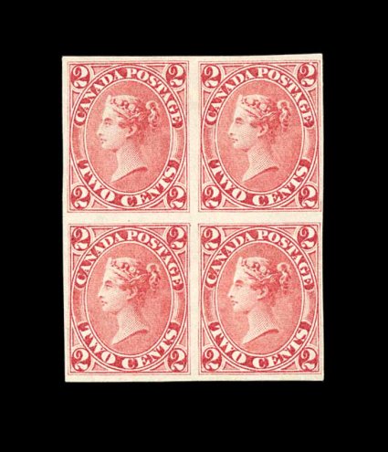 504 ogbl 20b image#20b, 1864 2c Rose, imperforate, an extremely rare and handsome block of four, without gum as issued, wonderfully bright and fresh, rich color, four large margins, very fine; an important showpiece of the issue, as only a few blocks still exist from the single known sheet of 100 stamps; 1990 Greene Foundation certificate (Unitrade C$7,500.00+). (Image) 5,000.00+