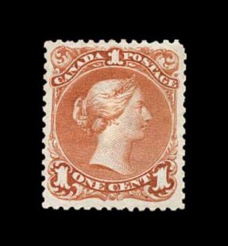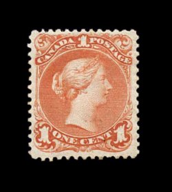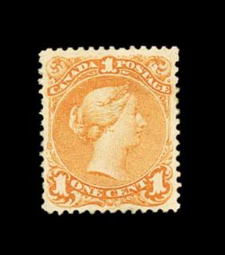 509 og 23a image#23a, 1868 1c Deep orange, a superlative mint example of this always difficult stamp, being marvelously well centered amid exceptionally large margins, brilliantly fresh color and a crisp detailed impression, full original gum, extremely fine; actually a very scarce stamp in this stellar quality; 1975 PF certificate (Unitrade C$2,475.00). (Image) 900.00