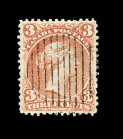 512 O 25a image#25a, 1868 3c Red, watermarked paper, used, exceedingly well centered within large margins which is quite unusual for a watermarked stamp, strong color, extremely fine (Unitrade C$500.00). (Image) 225.00
