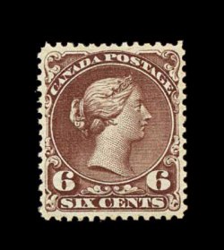 514 og 27c image#27c, 1868 6c Dark brown on thin paper, a magnificent mint example of this truly rare stamp, possessing flawless centering amid large margins, eye-arresting deep luxuriant color and a razor-sharp impression on bright paper, part o.g., extremely fine; a most remarkable stamp in this premium condition, even the Unitrade catalog does not attempt to price this in such superior condition; 1991 Green Foundation certificate; ex-"Crossings" Collection (Unitrade for fine C$1,500.00). (Image) 1,575.00