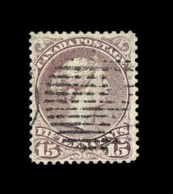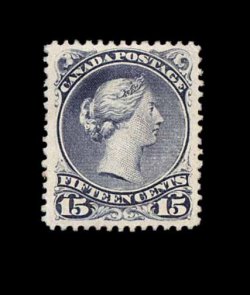 520 og 30c image#30c, 1868 15c Deep violet on very thick paper, an exceptional mint example of this important Canadian rarity, being the finest mint single we have ever seen, marvelously fresh and crisp, with rich luxuriant color and a strong impression on bright paper, exceptionally well centered and margined, full clean o.g., minor h.r., choice very fine; an exciting opportunity to acquire a key stamp for completion of the Large Queen issues; 1986 and 1995 Green Foundation certificates; ex-"Crossings" Collection (Unitrade C$9,000.00). (Image) 4,000.00