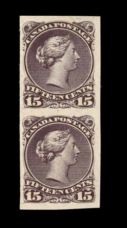 519 nh 29d image#29d, 1868 15c Gray violet, imperforate, vertical pair, very large margins all around, striking prooflike color and impression on fresh paper, clean o.g., never hinged, extremely fine; a most impressive pair of this very scarce imperforate; 1992 BPA certificate (Unitrade C$3,000.00). (Image) for hinged 1,150.00