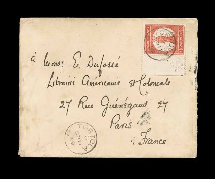 41 c S.G. #35 imageS.G. #35, 1887 4p Chestnut, a well centered left sheet-margin single, position 9, tied to 1889 commercial cover to the Library of America and Colonies in Paris, France by "Tortola/SP 11 89" c.d.s. with index letter "C", Type 10, additional strike at left, London transit on the reverse, very fine; a most unusual destination for mail out of the Virgin Islands in this early period, especially rare in this premium condition (Scott #16). (Image) Est. 1,500-2,000