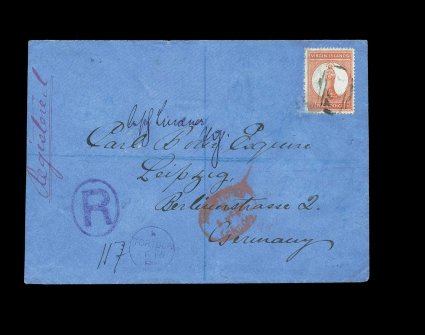 42 c S.G. 36 image#36, 1887 4p Pale Chestnut, tied to registered cover to Germany by scarce "A91" oval bar cancel, Type 8, the "Tortola/FE 15 88" c.d.s. with index letter "A", Type 9, is in a rare violet color matching the "R" in oval registry designation, backstamped, stamp has scuff to bottom left corner where a pair of 1p stamps, needed to make the 4p postage plus 2p registry fee, was removed, still an attractive cover from this early period with the stamp used contemporaneously with its issuance; 1992 RPS certificate (Scott #16 var.). (Image) Est. 400-500