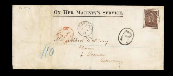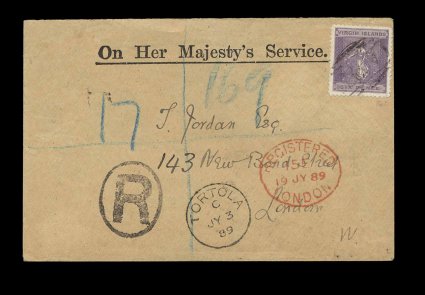 43 c S.G. #38 imageS.G. #38, 1887 6p Dull violet, a wonderfully well centered single of this first issue design re-issued in 1887 on watermarked paper, centrally struck "A91" oval bar cancel, Type 8, on lovely registered OHMS envelope to London, the cancel is strongly impressed showing through to the envelope thus "tying", "Tortola/JY 3 89" c.d.s. with index letter "C", Type 10, at bottom, and London registry ovals on front and back, extremely fine; this is an unusually choice cover for this early period with attractive markings and unusual freshness, quite scarce thus; ex-Seybold (Scott #17). (Image) Est. 1,000-1,500