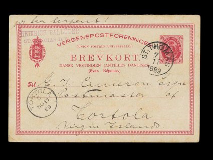 45 c image1889 Inbound 3c Danish West Indies postal card, the reply portion of a paid reply card, (Scott #UY1r), used as a normal postal card with "St. Thomas/7 11 1889" c.d.s. and "Tortola/NO 17 89" c.d.s. with index letter "C", Type 10, used as a receiving cancel, both markings on the face, addressed to the Postmaster of Tortola and message regarding a stamp account, very fine; while these two islands are in close proximity, mail between them is scarce and little inbound mail has been preserved from this early period. (Image) Est. 200-300