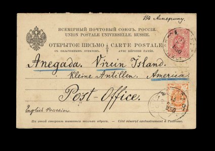 46 c image1890 Inbound Russian paid reply postal card, from Odessa and of greatest interest as this is addressed to the Island of Anegada, Odessa c.d.s. cancels the card and an additional 1k Orange adhesive, New York and St. Kitts transits plus "Tortola/FE 24 90" with inverted index "C", Type 10, used as a receiving marking, very fine; interestingly there was no post office on Anegada until late 1906, so it is doubtful that this ever reached Anegada since it was was addressed to the post office there, the correspondent was inquiring about purchasing postage stamps and such requests would be more properly handled at the main post office in Road Town where it did arrive, but nonetheless this has to be the earliest postal item sent to Anegada. (Image) Est. 1,000-1,500