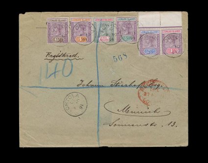 47 c Leewd Islds S.G. #1-5, 7 imageLeeward Islands S.G. #1-5, 7, 1/2p-6p, 1/- 1890 Queen Victoria, six different values tied to an 1891 registered cover to Munich, Germany, each stamp with strike of "Tortola/AP 10 91" c.d.s. with index letter "C", Type 10, London oval registry transit, backstamped, stamps are all well centered and fresh, cover has edge tears and wrinkles, probably due to heavy contents as this pays the six times the 1/2 ounce postage rate plus registry, otherwise very fine and attractive cover; Leeward Island stamps were used in Antigua, Dominica, Montserrat and St. Kitts-Nevis as well as Virgin Islands, usage in the Virgin Islands is the scarcest of any of these (Scott #1-5, 7). (Image) Est. 400-500