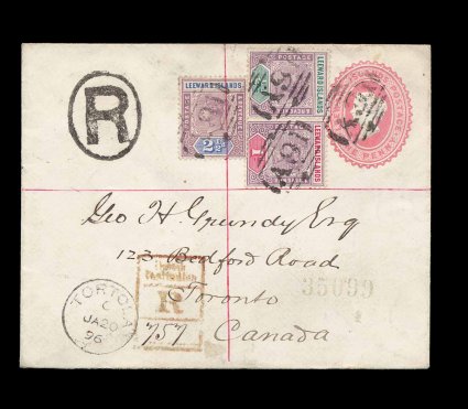48 c Leewd Islds S.G. #1-3 imageLeeward Islands S.G. #1-3, 1890 1/2p-2 1/2p Queen Victoria, tied to registered Leeward Islands 1c Pink postal entire (H&G #B1, 120x94mm) by scarce "A91" oval bars cancel, Type 8, with "Tortola/JA 20 96" c.d.s. with index letter "C", Type 10, posted to Toronto, Canada, St. Thomas and New York transits on the reverse as well as Toronto backstamp, attractive and very fine; a scarce and unusual destination with scarce cancels (Scott #1-3). (Image) Est. 200-300