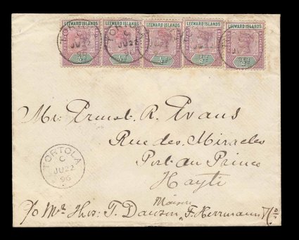 49 c Leewd Islds S.G. #1 imageLeeward Islands S.G. #1, 1890 1/2p Dull Mauve and green, five singles each tied by "Tortola/JU 22 96" c.d.s. with index letter "C", Type 10, with clear strike below, posted to Port au Prince, Haiti, St. Thomas and Jacmel transits, backstamped, light stains affecting stamps, otherwise a very fine commercial usage; not only are Leeward Islands stamps scarce used out of the Virgin Islands but this is a very scarce destination and rarely was inbound mail to Haiti preserved from this backward Caribbean country (Scott #1). (Image) Est. 400-500