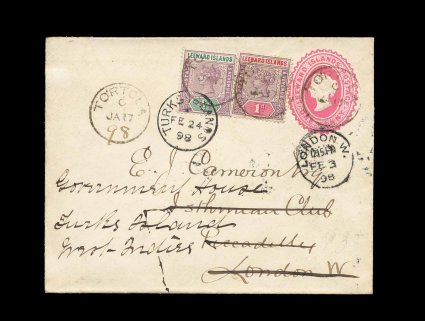 50 c Leewd Islds S.G. #1-2 imageLeeward Islands S.G. #1-2, 1/2p Dull mauve and green and 1p Dull mauve and rose, tied to Leeward Islands 1p Pink postal entire (H&G #B1, 120x94mm) by "Tortola/JA 17" c.d.s. with index letter "C", additional strike at left with manuscript "98" year date added by hand, Type 10 var., posted to London but forwarded back to Turks Island, London backstamp and re-posting duplex, Halifax transit on return trip, Turks Island receiving cancel tying the 1/2p value, very fine and attractive; a marvelous usage crossing the Atlantic twice (Scott #1-2). (Image) Est. 300-400