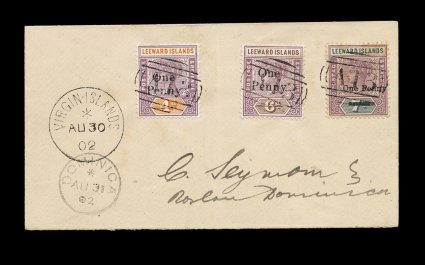 51 c Leewd Islds S.G. #17-19 imageLeeward Islands S.G. #17-19, 1902 1p on 4p to 1p on 7p Surcharges cplt., each tied to small cover by rare "A13" oval bar cancel, Type 7, with less commonly seen "Virgin Islands/AU 30 02" c.d.s., Type 11, that was used for a short period around the turn of the century, Dominica c.d.s. on face as a receiving cancel, very fine and pretty cover; this is the last year of use for the "A13" cancel, which started with its use on Great Britain stamps, but it was used very little at any time and is always rare on cover (Scott #17-19). (Image) Est. 200-300