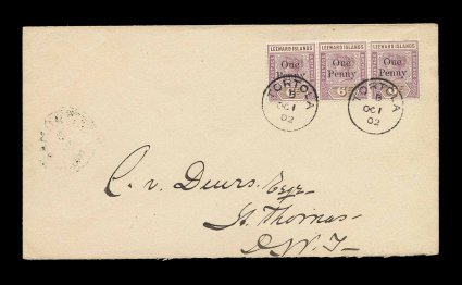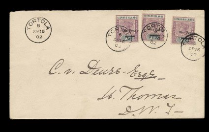 52 c Leewd Islds S.G. #18 imageLeeward Islands S.G. #18, 1902 1p on 6p Dull mauve and brown, fresh and attractive horizontal strip of three tied to clean 1902 cover to St. Thomas, tied by "Tortola/OC 1 02" c.d.s. with index letter "B", Type 10, backstamped, very fine; this cancel with index letter "B" was apparently used in late 1902 and is seldom seen, index letter "C" or without index being the norm (Scott #18). (Image) Est. 200-300
