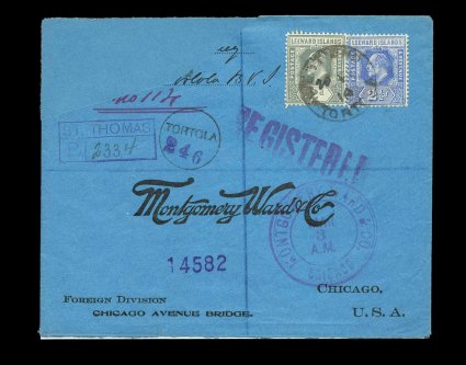 54 c Leewd Islds S.G. #39-40 imageLeeward Islands S.G. #39-40, 1907-11 2p Grey and 2 1/2p Bright blue, tied to registered printed commercial envelope to Montgomery Ward & Co. in Chicago, by quite scarce "West End/Tortola/20 FE 14" c.d.s.,Type 18, variety with "20" written in manuscript, similar strike on the reverse, from there to the main post office at Road Town with that city's Type 17 double circle c.d.s. on the reverse, plus a rare provisional registry handstamp made up of the Type 9 "Tortola" c.d.s. was applied at Road Town, St. Thomas and New York transits, backstamped Chicago, the corner of the cover with the return address has been cut away, but nevertheless an important cover with only two examples known of the early Tortola c.d.s. converted to a registry handstamp (Scott #44-45). (Image) Est. 300-400