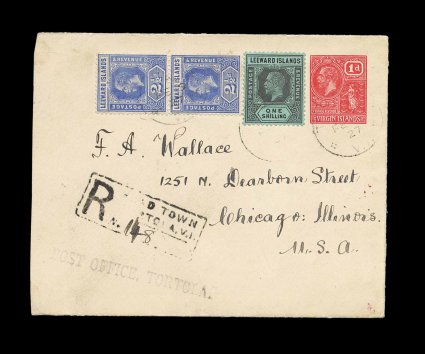 55 c Leewd Islds S.G. #50,73 imageLeeward Islands S.G. #51, 73, 1912 2 1/2p Bright blue vertical pair and 1923 1/- Black on emerald, tied to Virgin Islands 1p Red on white laid paper postal envelope, the rare last King George V issue (BVI #PS10), stamps are tied by light "Tortola/V.I./FE 9 27" c.d.s., Type 21, registered to the United States with Road Town registry handstamp and "Post Office, Tortola" straight line handstamp at bottom left, St. Thomas transit and backstamped Chicago, fresh and very fine; it is far more common to have Virgin Island stamps on Leeward Islands stationery than the other way around as this is; a very high value franking on a postal envelope that is by far the rarest postal stationery item of Virgin Islands, very few are known used in any manner, let alone in this unusual way (Scott #50, 76). (Image) Est. 750-1,000