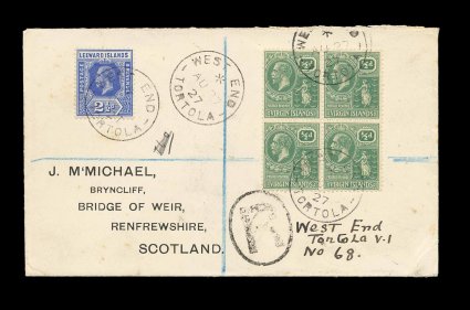 56 c Leewd Islds S.G. #67 imageLeeward Islands S.G. #67, 1927 2 1/2p Bright blue, single in combination with 1922 1/2p Dull green block of four of Virgin Islands (S.G. #86), both tied to 1927 registered cover to Scotland by nice strikes of new "West End/Tortola/AU 27 27" c.d.s., Type 22, distinguished from the earlier cancel by the asterisk over the date, handwritten registry designation "West End/Tortola V.I/No 68" next to the "R" in oval handstamp at bottom right, Tortola (Road Town), St. Thomas and New York transits, very fine and a surprisingly scarce early use of this cancel, which was placed in use in 1927 (Scott Leeward Islands #74, Virgin Islands #53). (Image) Est. 200-300