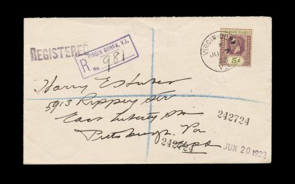 57 c Leewd Islds S.G. #71 imageLeeward Islands S.G. #71, 1922 5p Dull purple and olive green, tied to neat 1923 registered cover to the United States by a nice strike of the difficult "Virgin-Gorda/V.I./JU 7 23" c.d.s., Type 12, Tortola (Road Town) and St. Thomas transits, backstamped Pittsburgh, extremely fine cover from one of the scarcer post offices on a smaller island. (Image) Est. 300-400