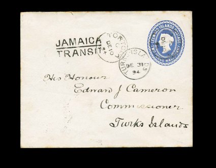 58 c imageLeeward Islands 2 1/2p Light blue postal entire (H&G B2, 120x94mm), with "Tortola/DE 10 94" c.d.s., Type 10, on imprint and at left, to Turks Islands, bold two line "Jamaica/Transit" and Turks Islands receiving c.d.s. on the front, St. Thomas and Kingston transits on the reverse, very fine; attractive usage to the Commissioner on Turks Islands. (Image) Est. 300-400