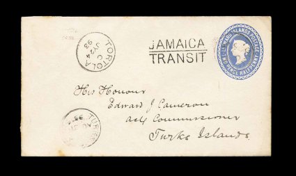 59 c imageLeeward Islands 2 1/2p Light blue postal entire (H&G #B2a 140x78mm), with "Tortola/JY 24 93" c.d.s., Type 10, on imprint and at left, to Turks Islands, bold two-line "Jamaica/Transit" and Turks Islands receiving c.d.s. on the front, St. Thomas and Kingston transits on the reverse, trace of edge toning, still very fine; attractive usage to the Commissioner on Turks Islands. (Image) Est. 300-400