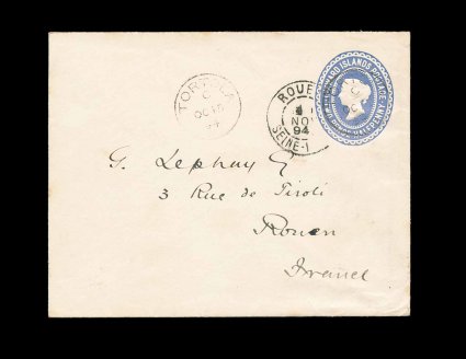 60 c imageLeeward Islands 1891 2 1/2p Light blue postal entire (H&G #B2, 120x94mm), to France with "Tortola/OC 15 94" c.d.s. with index letter "C", Type 10, on imprint and at left, Rouen receiving c.d.s. on front, very fine and scarce destination with very little mail going to France. (Image) Est. 300-400