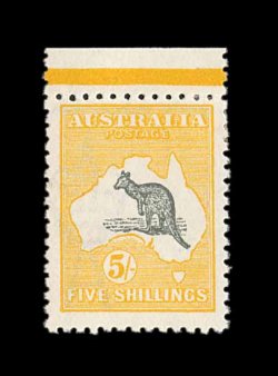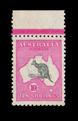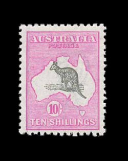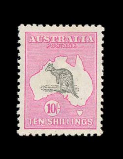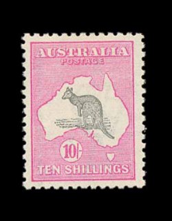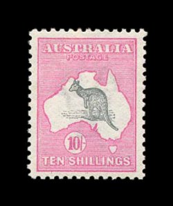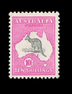 637 og S.G. 43 var. imageS.G. #43 var., 1917 10/- Grey and pink, broken tail on kangaroo, extraordinarily well centered, bright and fresh, o.g., lightly hinged, extremely fine (Scott #55 var.; $400.00+, BW #48Ad; unpriced in this shade). (Image) £400+