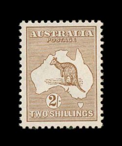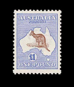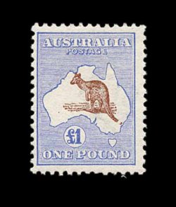 623 og S.G. 15 var. imageS.G. #15 var., 1913 £1 Brown and ultramarine, broken tail on kangaroo, bright and fresh, o.g., lightly hinged, nearly very fine; a seldom offered variety (Scott #14 var.; $1,300.00+, BW #51d; A$1,800.00). (Image) £1,000+