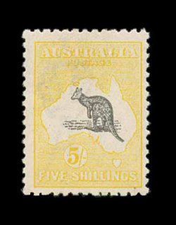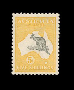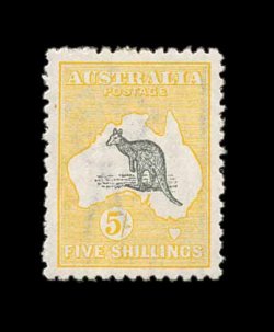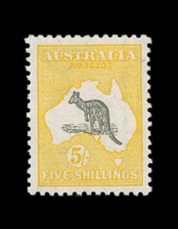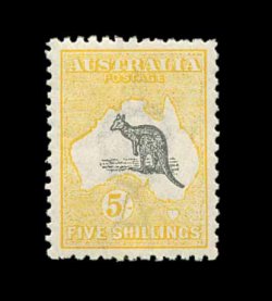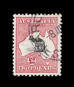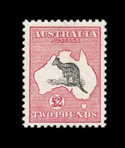 624 og S.G. 16 imageS.G. #16, 1913 £2 Black and rose, an exceedingly choice mint example of the rarest Kangaroo stamp, possessing a wonderful overall freshness, with bright rich colors and a crisp impression on clean white paper, quite well centered, o.g., lightly hinged, choice very fine; signed Koslow (Scott #15; $2,350.00). (Image) £2,500