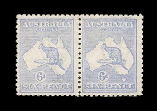 630 og S.G. 38da imageS.G. #38da, 1915 6p Pale ultramarine, leg of kangaroo broken, position 6, being the right stamp in a horizontal pair with the normal, fresh color in the correct pale shade that this error comes in, o.g., very lightly hinged, very fine; a seldom seen error, particularly se-tenant in a pair with a normal stamp; 1995 APS certificate (Scott #48a var., BW #20cd; A$2,500.00+). (Image) £2,250+