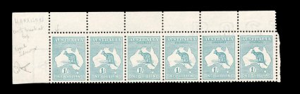 631 nh S.G. 40ba imageS.G. #40ba, 1927 1/- Blue green, Die IIB, watermark sideways, top left corner sheet margin horizontal strip of six, with position 1 showing the broken top frame at left variety (BW #33d, unlisted on the watermark sideways stamp), fresh color, o.g., never hinged, a very fine and handsome showpiece (Scott #51b var., BW #33a; for hinged A$600.00+). (Image) for hinged £360+