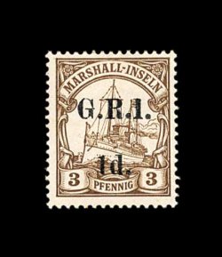 781 og S.G. #64c imageS.G. #64c, 1915 "G.R.I./1d." surcharge on 3pf Brown, this is from the rare 6mm wide spacing issue, Gibbs setting 1B, mint single, fresh, o.g., h.r., very fine; not only is this the wide setting of which very few Marshall Islands stamps were overprinted, but setting 1B is an anomaly position that does not fit into the normal settings, heretofore this was only found on stamps of German New Guinea, this is the first Marshall Island stamp of any value to be recorded from this setting; 2001 Robert Gibbs certificate (Scott #30 var.). (Image) £950+