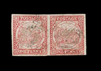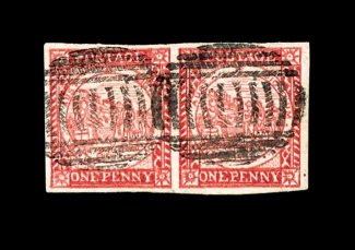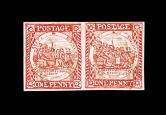 784 O S.G. #13 imageS.G. #13, 1850 1p Carmine on laid paper, superb horizontal pair (positions 11-12), bright color, huge even margins, neat oval barred cancels, extremely fine; 1996 RPS of Victoria certificate (Scott #2b; $900.00+). (Image) £950+