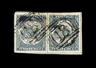 785 O S.G. #23 imageS.G. #23, 1850 2p Grey-blue, Plate II early impression, incredible quality horizontal pair, remarkably intense impression showing all of the fine details of the engraving, deep color, enormous margins all around, clear "18" (Mudgee) cancels, extremely fine; 1991 PF certificate (Scott #5h; $450.00+). (Image) £450+