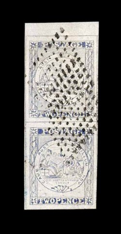 786 O S.G. #29 imageS.G. #29, 1850 2p Ultramarine, Plate III, a magnificent top sheet-margin vertical pair, lower stamp shows particularly worn impression with background lines at bottom almost completely missing, huge margins all round including 4mm sheet margin, cancelled by two crisp strikes of the rare diamond of dots cancellation, extremely fine in every respect; a gem for both the connoisseur of classic stamps and the cancellation collector; 1996 PF certificate ex-Manwood (Scott #6). (Image) Est. 750-1,000