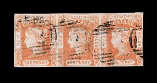 787 O S.G. #47 imageS.G. #47, 1851 1p Vermilion on bluish wove paper, used horizontal strip of three, large even margins all around, bright color, barred oval cancels leaving most of the Queen's profiles clear, very fine multiple; signed A. Diena (Scott #13; $330.00+). (Image) £300+