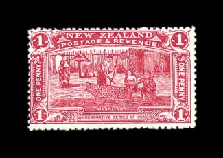 788 og S.G. #371a imageS.G. #371a, 1906 1p Claret New Zealand Exhibition, only one sheet of 60 in this claret color was issued at the exhibition, it was considered unsatisfactory and immediately withdrawn, being replaced by the 1p vermilion, centered to the top left as were all the stamps in this single sheet, strong bright color, o.g., h.r, and minor paper adherence, light gum creasing which is entirely natural, otherwise very fine for this rare variety and a key stamp of New Zealand; 2000 RPS of New Zealand certificate (Scott #123a; $6,000.00). (Image) £6,000