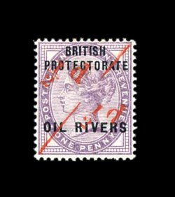 789 og S.G. #7ac imageS.G. #7ac, 1893 1/2p on half of 1p Violet, red surcharge, unsevered pair, fresh mint single with strong clear surcharge showing the variety straight top to "1" in the top half, o.g., h.r. very fine; both the unsevered pair and the variety are scarce in their own right, but the combination of the two is extremely rare; 2000 BPA certificate (Scott #7c var.). (Image) Est. 1,000-1,500