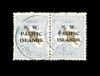 795 O S.G. #118 imageS.G. #118, 1922 £1 Bistre brown and grey blue, Die II, the extremely rare printing from the last uniform setting (overprint Type 11), amazing used horizontal pair, possessing the characteristic grey blue shade of the frame and deep brown of the central vignette, very well centered, extremely fine; this is one of the scarcest values of the North West Pacific Islands and as a multiple it is almost unheard of, in fact this is the only recorded multiple of this stamp; a major rarity and must for the collector building an award winning collection of these issues; 2001 RPS of Victoria; ex-Evans (Scott #38; $8,000.00+). (Image) £8,000+